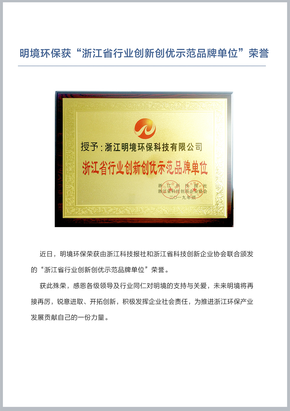 明境環(huán)保獲“浙江省行業(yè)創(chuàng)新創(chuàng)優(yōu)示范品牌單位”榮譽(yù)