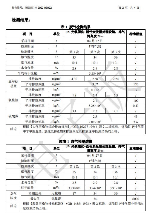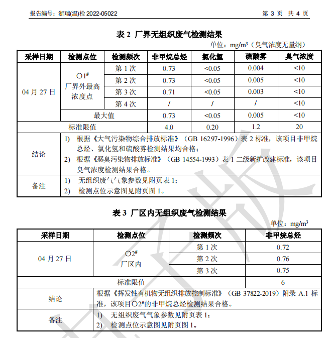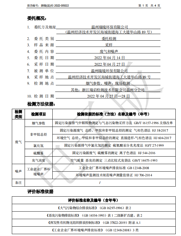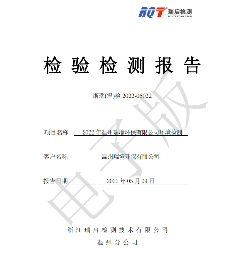 關于2022年溫州瑞境環保科技有限公司環境檢測報告的公示